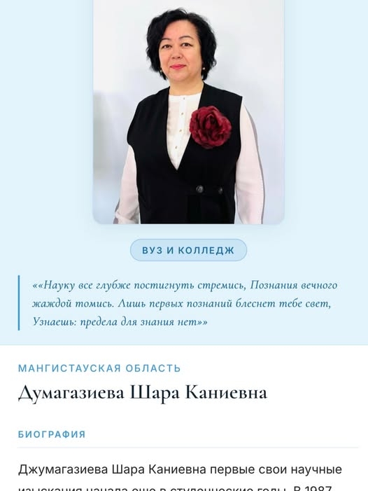 Қазақстанда ғылыммен айналысып жүрген әйелдер тізіміне Х.Өзбекғалиев атындағы Маңғыстау жоғары политехникалық колледжінің арнайы пән оқытушысы, техника ғылымының кандидаты Джумагазиева Шара Каниевнаның есімі енгендігін қуана хабарлаймыз.